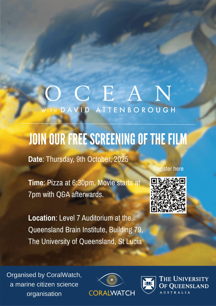 Join CoralWatch on Thursday 9 October at The University of Queensland for an inspiring evening that celebrates the beauty of our ocean and explores the urgent need for its conservation. Enjoy free pizza from 6:30pm, followed by a screening of OCEAN narrated by Sir David Attenborough at 7:00pm. Register here